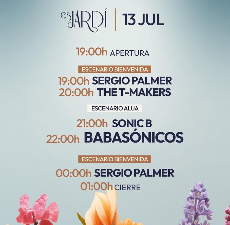El talento local también tendrá su espacio en Es Jardí. El viernes 12 de julio se presentarán Cuervo Hermanos, con su mezcla de rumba latina, flamenco y pop, y el DJ Kill Beat. El sábado 13 será el turno de The T-Makers, una banda de rock sesentero, y el DJ Sergio Palmer.